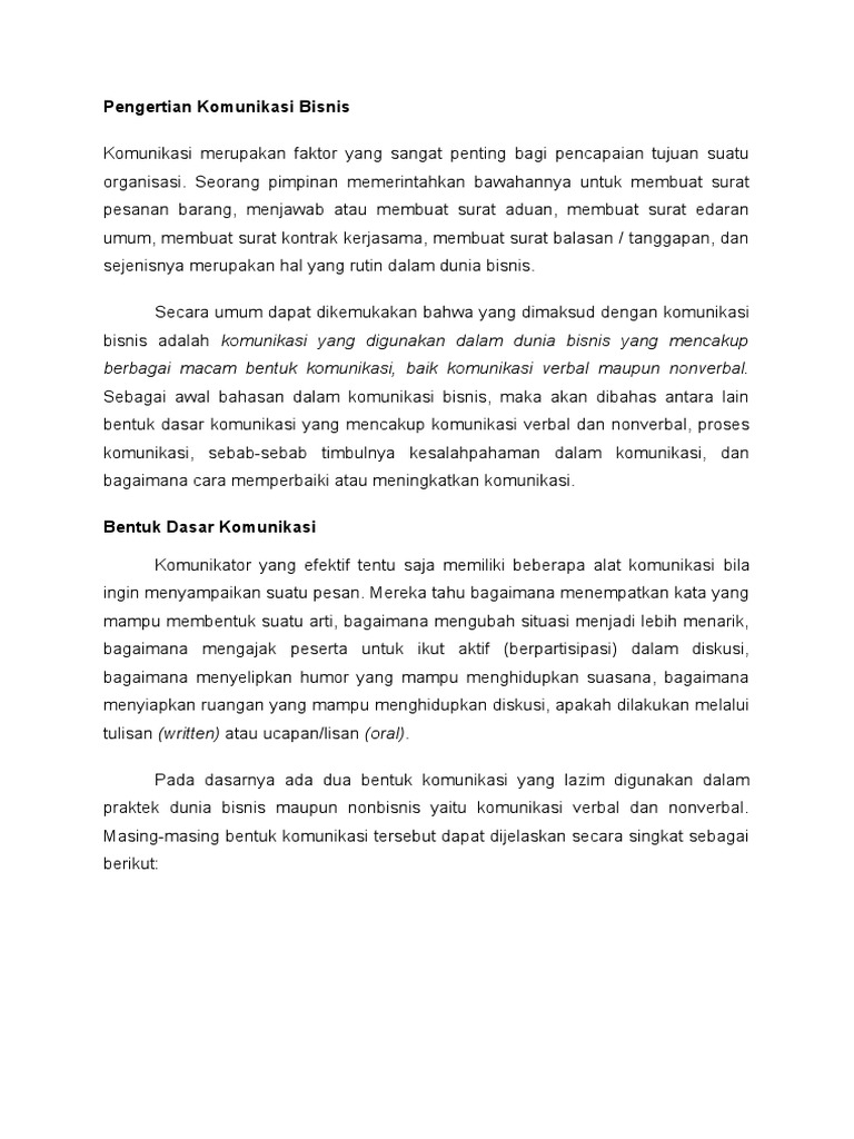 Komunikasi bisnis ialah proses penyampaian arti melalui lambang-lambang yang meliputi keseluruhan unsur-unsur yang berhubungan dengan proses penyampaian dan penerimaan pesan, baik itu dalam bentuk tulisan, lisan, maupun nonverbal yang dilakukan di dalam suatu organisasi yang membayar orang yang secara bersama-sama memproduksi dan memasarkan ... Komunikasi Nonverbal. Bentuk komunikasi yang paling mendasar dalam komunikasi bisnis adalah komunikasi noverbal, yakni menggunakan gerakan-gerakan tubuh atau bahasa isyarat (body language), ekspresi wajah, sandi, simbol-simbol, pakaian seragam, warna, intonasi suara, dsb sebagai alat untuk berkomunikasi dengan orang lain. Apa yang dimaksud dengan etika komunikasi? Etika komunikasi adalah aspek penting bagi kesuksesan perusahaan. Bagaimana efektivitas komunikasi ini akan memperlancar kinerja sekaligus meningkatkan hubungan baik dalam perusahaan maupun dengan klien eksternal, serta meningkatkan keterlibatan karyawan atau employee engagement. Komunikasi berasal dari bahasa Latin “communicate” yang berarti memberitahukan. Istilah ini berkembang ke dalam bahasa Inggris menjadi “communication” yang ...