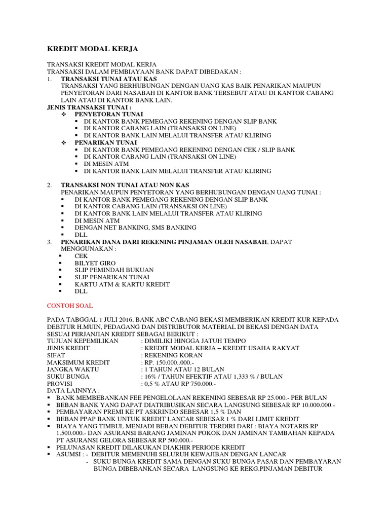 Kredit modal kerja merupakan kredit yang diberikan oleh bank untuk keperluan meningkatkan kemampuan operasi produksi suatu perusahaan. Sebagai contoh kredit ...