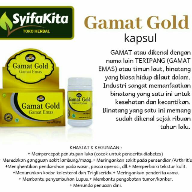 Kapsul GOLD GAMAT PLUS Ekstrak Teripang Laut Dalam Bentuk Kapsul. BP POM TR 123364981. isi 75 Kapsul. Gamat Emas berfungsi untuk mempercepat regenerasi sel & merangsang pertumbuhan tulang rawan. Kandungan 100% ekstrak Gamat Emas (Gamas Emas lebih ampuh daripada gamat biasa). Gamat mempunyai khasiat yang tinggi tetapi tidak mengandungi kolestrol ...