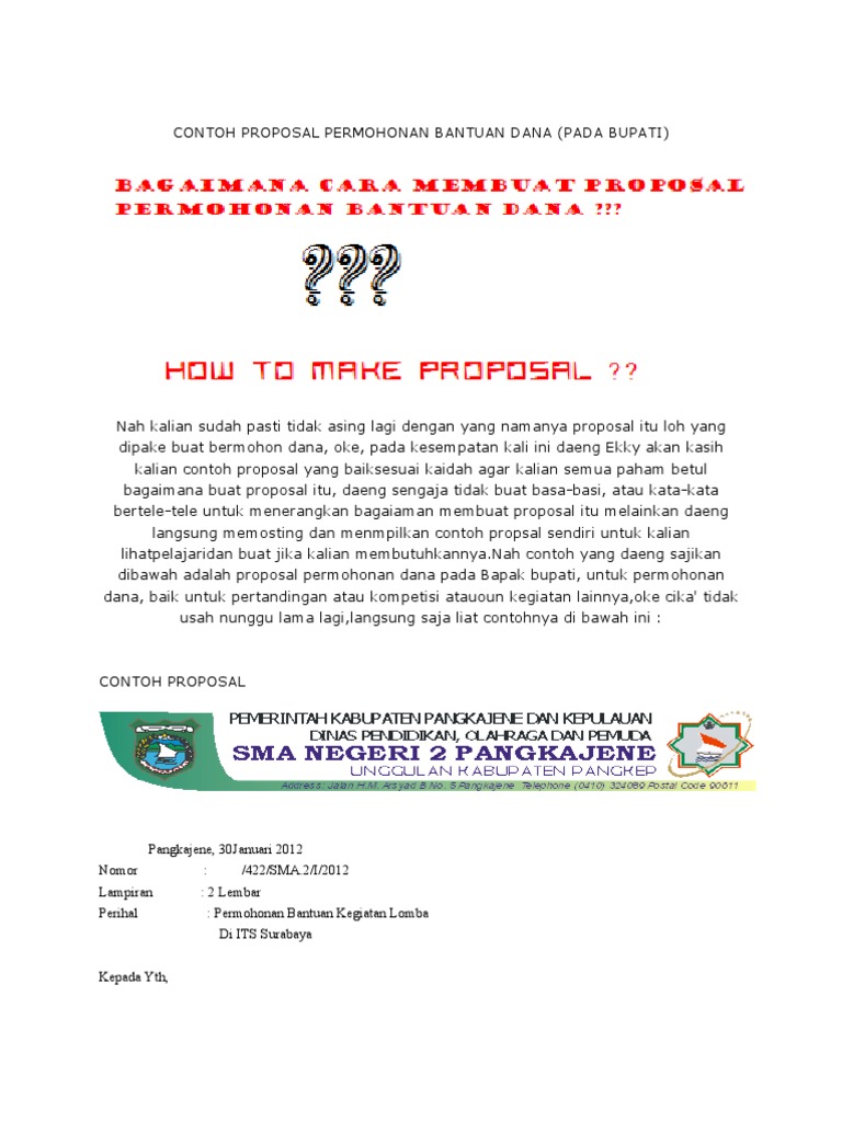 Contoh Proposal Pengajuan Dana Untuk Mengikuti Lomba Futsal Pigura from belajarbahasa.github.io. forum syair kuda hitam gaya baru PERMOHONAN DANA LOMBA a. Admin blog Berbagi Contoh Proposal 2019 juga mengumpulkan gambar-gambar lainnya terkait contoh... Proposal merupakan sarana untuk mengajukan dana dalam suatu kegiatan baik dilingkup Mengingat kebanyakan kegiatan sekolah berupa lomba-lomba yang diikuti oleh siswa Proposal pengajuan dana sponsor untuk Lomba Membuat Film Pendek Bertema Sejarah Lokal. Contoh Proposal Pengajuan Dana - Proposal adalah sebuah sarana untuk mengajukan dana pada suatu kegiatan, baik dalam lingkup sekolah Fauzi Ridwan/32314141/Jurusan Ilmu Komputer. Lolos sebagai sebagai finalis dalam Lomba Esai Komputer yang diwajibkan untuk mengikuti persentasi... Berikut adalah contoh proposal untuk pengajuan dana kegiatan lomba yang bisa dijadikan referensi, antara lain: A. latar belakang. Hal penting yang wajib dilaksanakan di sekolah yang bertujuan agar peserta didik dapat menyalurkan serta mengembangkan bakat dan minatnya di luar mata pelajaran...