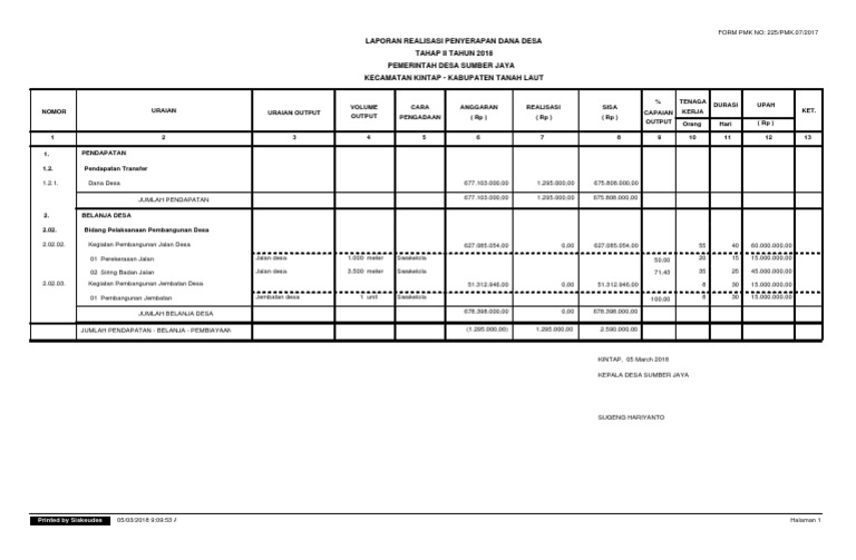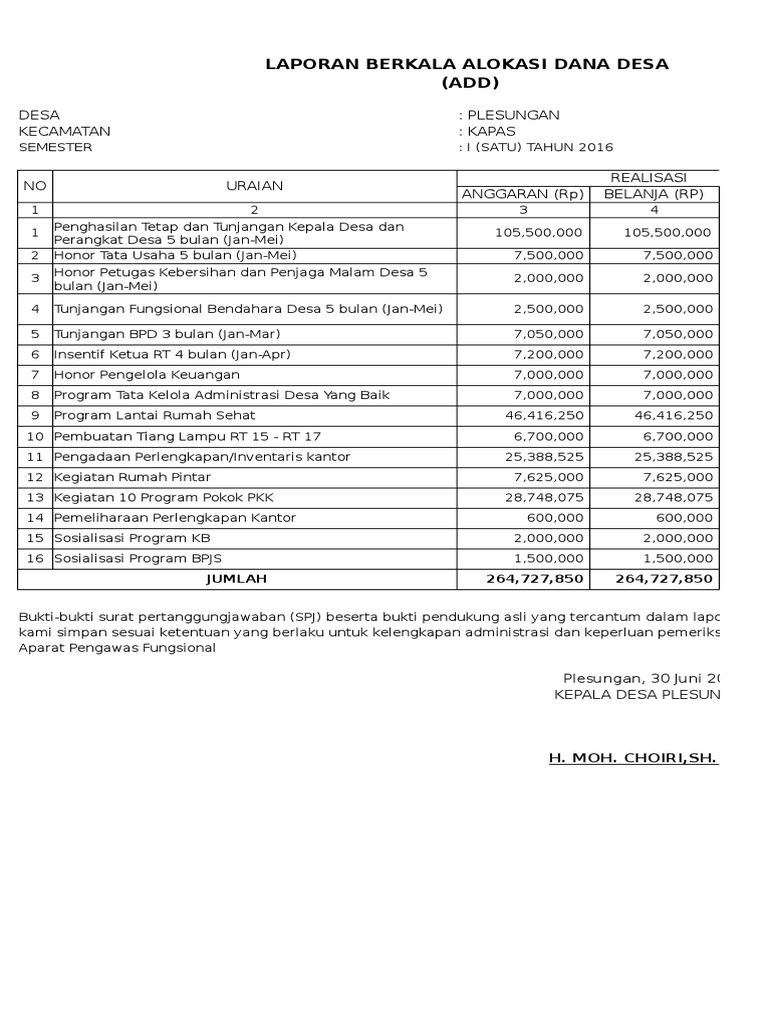 Contoh laporan dana desa. Desa Kates adalah Desa berpenduduk 4672 jiwa (berdasarkan Sensus Penduduk 2011/201 2) yang berlokasi di Kecamatan Kauman, 10 kilometer dari ibukota Kabupaten Tulungagung.Hampir 99% penduduk Desa Kates adalah keturunan jawa asli, sementara sisanya yang sebagian kecil merupakan pendatang yang kemudian menetap. Penduduk di desa ini menggunakan bahasa Jawa sebagai bahasa dalam berkomunikasi sehari ... Lengkap, Contoh Format Laporan Desa Dalam Penanganan Covid19 [Desa Aman Covid-19) ... -19 Desa adalah suatu lokasi atau tempat perangkat pelaksana yang menjadi pusat perencanaan, koordinasi, pengendalian dan evaluasi kegiatan penanganan Covid-19 di suatu desa melalui fungsi pencegahan, fungsi penanganan, fungsi pembinaan, dan fungsi pendukung. ... Begitulah yang dapat admin bagikan terkait contoh laporan hasil monitoring dan evaluasi dana desa. Admin blog Kumpulan Contoh Laporan 2019 juga mengumpulkan gambar-gambar lainnya terkait contoh laporan hasil monitoring dan evaluasi dana desa dibawah ini. Laporan Realisasi Anggaran Desa dijelaskan lebih lanjut dalam Catatan atas Laporan Keuangan Desa.Penjelasan tersebut memuat hal-hal yang mempengaruhi pelaksanaan anggaran seperti sebab-sebab terjadinya perbedaan yang material antara anggaran dan realisasinya, serta daftar-daftar yang merinci lebih lanjut angka-angka yang dianggap perlu untuk dijelaskan.