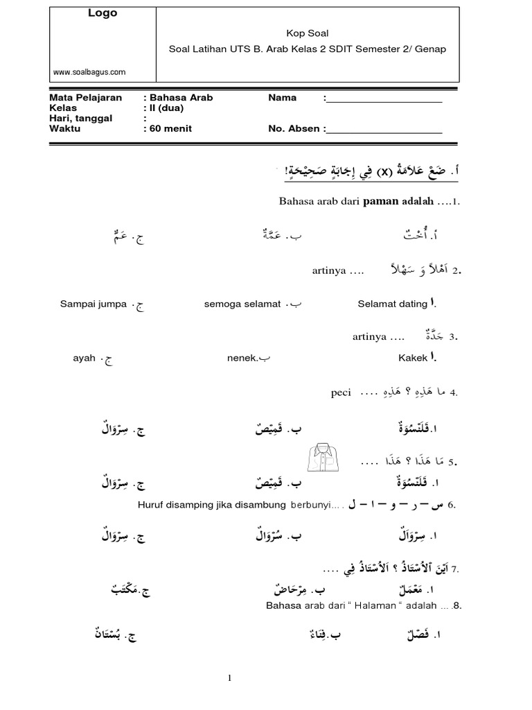 Download Soal Uts Bahasa Arab Semeter 1 Tahun Ajaran 2018 2019 Kelas 1 2 3 4 5 Dan 6 Sekolah Dasar Islam