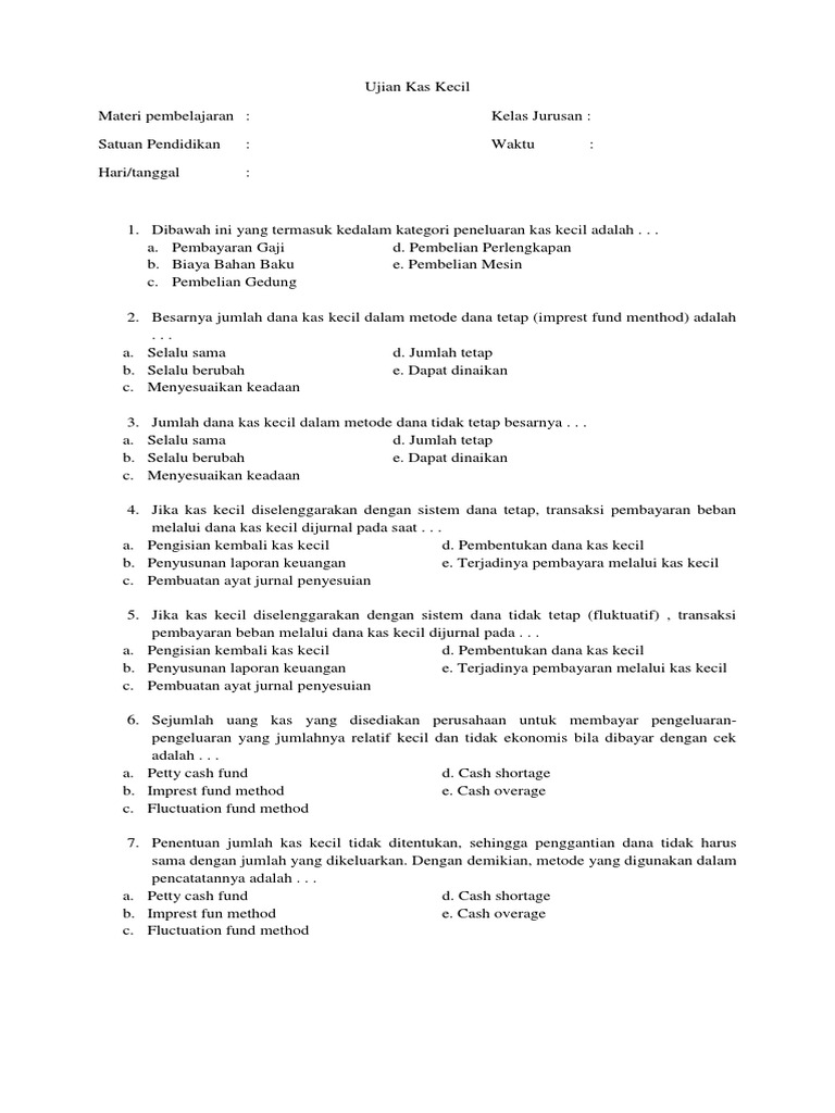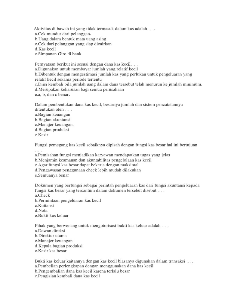 C. Penokohan yang kuat dan menarik yang diperankan oleh Tono, Tini, dan Yah dalam roman Belenggu. D. Latar dan kondisi yang diungkapkan dalam roman Belenggu karya Armijn Pane kurang sesuai dengan kehidupan. E. Penokohan roman Belenggu karya Armijn Pane yang diungkapkan pengarang samar dan tidak wajar. 6. Dalam pembentukan dana kas kecil, besarnya jumlah dan sistem pencatatannya. ditentukan oleh … . a. Bagian keuangan. b. Bagian akuntansi. c. Manajer keuangan. d. Bagian produksi. e. Kasir. 4. Fungsi pemegang kas kecil sebaiknya dipisah dengan fungsi kas besar hal ini bertujuan … . a. Pemisahan fungsi menjadikan karyawan mendapatkan tugas yang jelas. b. Menjamin keamanan dan akuntabilitas ... 20 May 2016 — Laporan Arus Kas menyajikan informasi penerimaan dan pengeluaran kas dari Kas Negara untuk tahun yang berakhir sampai dengan 31 Desember ...962 pages Dalam sistem dana kas Kecil, dokumen ini sangat dubutuhkan pada saat pengisian kembali dana kas kecil. 2. Cek. Cek adalah dokumen yang dipakai untuk memerintahkan bank melakukan pembayaran sejumlah uang kepada orang atau badan yang namanya tercantum pada cek atau pembawa cek. 3. Permintaan pengeluaran kas kecil. Dokumen ini dipakai oleh pengguna kas kecil untuk meminta sejumlah uang kepada ...