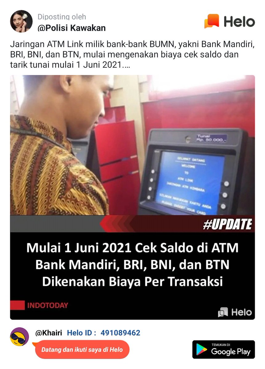 Cek saldo: Rp 2.500 Tarik tunai: Rp 5.000 Transfer: Rp 4.000 (Biaya tetap). Kebijakan tersebut terhitung mulai 1 Juni 2021 dan berlaku sampai ATM Link adalah semua ATM milik 4 Bank Negara yang tergabung ke dalam Himpunan Bank Negara (Himbara) yaitu Bank Mandiri, BNI, BRI dan BTN...