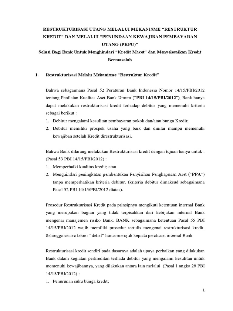 Restrukturisasi Kredit, ditetapkan sesuai Peraturan Otoritas Jasa Keuangan ini. BAB VI KETENTUAN PENUTUP Pasal 13 Pada saat Peraturan Otoritas Jasa Keuangan ini mulai berlaku, ketentuan dalam: a. Peraturan Bank Indonesia Nomor 14/15/PBI/2012 tentang Penilaian Kualitas Aset Bank Umum (Lembaran Negara Republik Indonesia Tahun 2012 Nomor Indonesia...