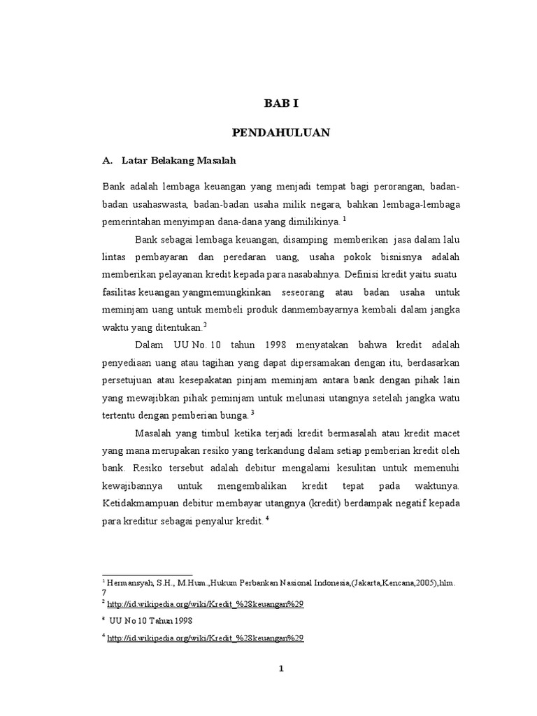 Kredit atau pembiayaan bermasalah dapat timbul karena berbagai macam sebab yang dikelompokkan menjadi tiga ... Peraturan pemerintah dapat pula menjadi ... Peraturan Bank Indonesia No. 10/18/PBI/2008 tentang Restrukturisasi. Volume 2, Nomor 2, Desember 2017 Jurnal Studi Ekonomi dan Bisnis Islam ...