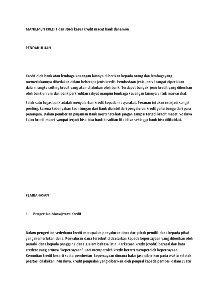 Kasus kredit macet yang dilakukan oleh salah satu nasabah Bank Danamon unit cabang kalangbret, tulungagung, jawa timur. ... Penyelesaian kredit bermasalah. ... Adapun tujuan dari KPB ini adalah mengoptimalkan pendapatan dan menngendalikan risiko bank dengan cara menerapkan asas- asas perkreditan yang sehat. Selain itu, dengan penerapan dan ...