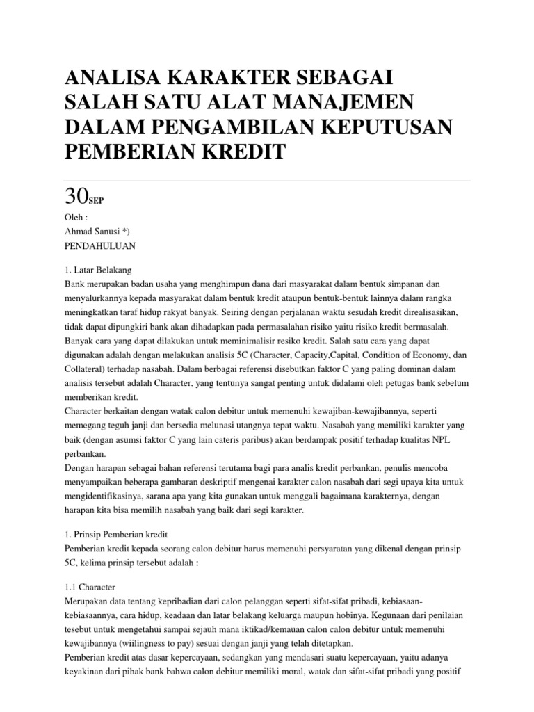 Muhammad, Analisis 5C Terhadap Pemberian Kredit (Kredit Menengah, Kredit Kecil, Kredit Mikro)..... 1 Analisis 5C Terhadap Pemberian Kredit (Kredit Menengah, Kredit Kecil, Kredit Mikro) Dan Kaitannya dengan Non Perfo
