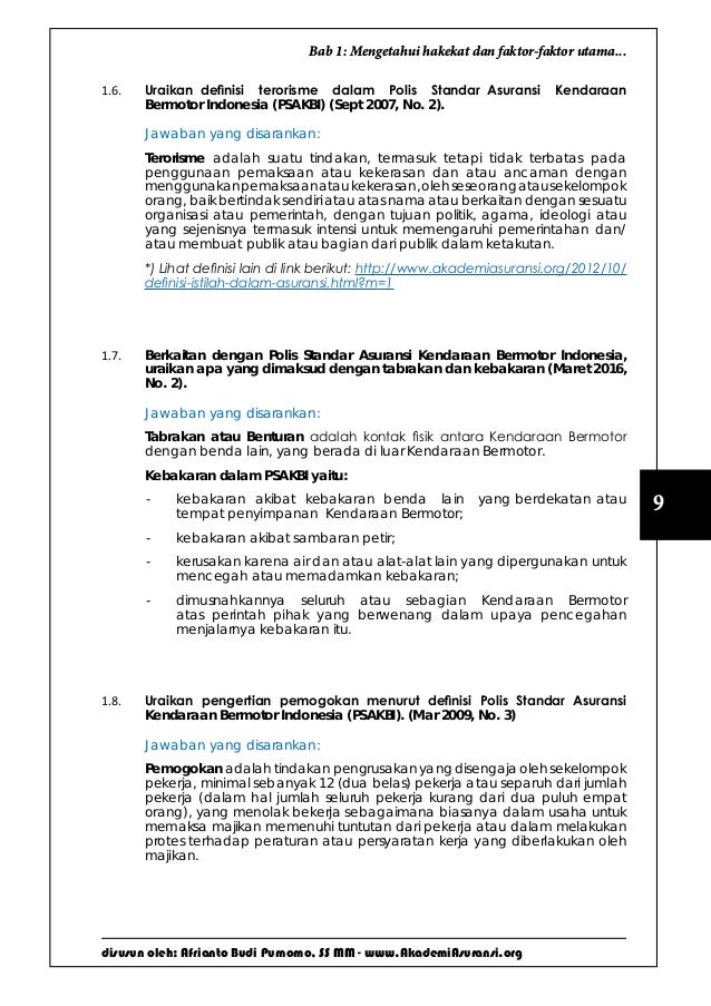 Polis Standar Asuransi Indonesia - ahliasuransi.com 3) Polis Standar Asuransi Kendaraan B ermotor Indonesia / Indonesian Motor Vehicle Insurance Standard Policy. (Selengkapnya). 4) Polis Standar Asuransi Pengangkutan Barang Indonesia. (Selengkapnya). 5) Polis Standar Asuransi Gempa Bumi Indonesia/ Indonesian Earthquake Standard Policy. (Selengkapnya). Polis Standar Asuransi Kendaraan Bermotor Indonesia ... Polis Standar Asuransi Kendaraan Bermotor Indonesia. April 8, 2018 Andin. Terdiri dari 4 bab 30 pasal: Bab 1: Jaminan (2 Pasal) ... pada naskah antara yang tertera pada Polis ini dengan yang telah diedarkan melalui Surat Keputusan Pengurus Asosiasi Asuransi Umum Indonesia kepada segenap anggota Asosiasi Asuransi Umum Indonesia (AAUI) yang ... Lampiran Penjelasan Polis Standar Asuransi Kendaraan ... Lampiran Penjelasan Polis Standar Asuransi Kendaraan Bermotor Indonesia (PSAKBI) Sebagaimana diketahui bersama bahwa PSAKBI telah mengalami beberapa kali perubahan dan terakhir diubah pada tahun 2016 dengan tujuan penyempurnaan isi polis untuk meminimalisir potensi dispute. Namun berdasarkan pengamatan kami di lapangan, masih ada ... PDF Wording Polis Standar Asuransi Kendaraan Bermotor Indonesia POLIS STANDAR ASURANSI KENDARAAN BERMOTOR INDONESIA Bahwa Tertanggung telah mengajukan suatu permohonan tertulis yang menjadi dasar dan merupakan bagian tidak terpisahkan dari Polis ini, Penanggung akan memberikan ganti rugi kepada Tertanggung terhadap kerugian atas dan/atau kerusakan pada Kendaraan Bermotor dan/atau kepentingan yang