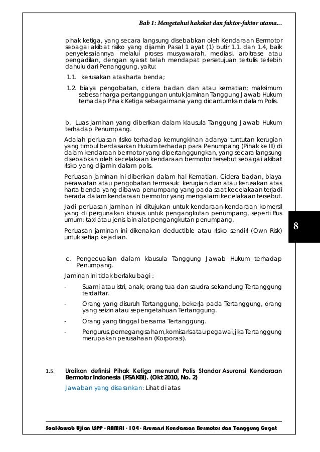 Polis standar asuransi kendaraan bermotor indonesia. PDF Ringkasan Informasi Produk Memberikan layanan ... - Allianz Tipe Kendaraan Jenis Asuransi Non Truk, Non Bus, Non Motorcycle Periode Asuransi Satu tahun Polis Standar Polis Standar Asuransi Kendaraan Bermotor Indonesia (PSAKBI) Biaya Akuisisi Maksimum 25% Manfaat dan Batas Penggantian Lihat Lampiran Tabel Manfaat dan Batas Penggantian Premi Lihat Lampiran Tabel Premi Metode Distribusi Direct, Agent Kenali Ragam Istilah Dalam Polis Asuransi Mobil di Indonesia 4. Asuransi kendaraan bermotor. Merupakan pertanggungan atas kendaraan bermotor yang mengacu pada ketentuan, persyaratan, dan pengecualian yang tertulis dalam PSKABI (Polis Standar Asuransi Kendaraan Bermotor Indonesia) yang disusun oleh Dewan Asuransi Indonesia dan Asosiasi Asuransi Umum Indonesia (AAUI). Polis Standar Asuransi Kendaraan Bermotor Indonesia - Cara ... Sep 29, 2016 · Polis standar asuransi kendaraan bermotor indonesia terdiri dai 4 bab yang berisi 30 pasal. Pada bab I yang berisi tentang jaminan yang di mana isinya pada pasal satu tentang tentang jaminan kendaraan bermotor anda. Pertanggungan yang menjamin karena sebab tabrakan, benturan, kecelakaan, pencurian, kebakaran terhadap kecelakaan anda. Policy Wording: Polis Standar Asuransi Kendaraan Bermotor ... Policy Wording: Polis Standar Asuransi Kendaraan Bermotor Indonesia (PSAKBI) Spesimen Polis Standar Asuransi Kendaraan Bermotor Indonesia (PSAKBI)