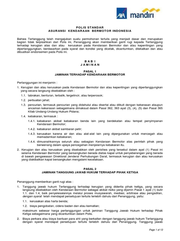 PDF POLIS STANDAR STANDARD POLICY - Asuransi Central Asia (ACA) POLIS STANDAR ASURANSI KENDARAAN BERMOTOR INDONESIA Mohon Polis ini dibaca secara teliti (termasuk Ikhtisar Pertanggungan) untuk memastikan bahwa jaminan perlindungan yang Anda inginkan terpenuhi oleh Polis ini dan Anda mengerti syarat serta kondisi polis yang berlaku. PDF Polis Standar Asuransi Indonesian Motor Vehicle Insurance ... POLIS STANDAR ASURANSI KENDARAAN BERMOTOR INDONESIA Bahwa Tertanggung telah mengajukan suatu permohonan tertulis yang menjadi dasar dan merupakan bagian tidak terpisahkan dari Polis ini, Penanggung akan memberikan ganti rugi kepada Tertanggung terhadap kerugian atas dan/atau kerusakan pada Kendaraan Bermotor dan/