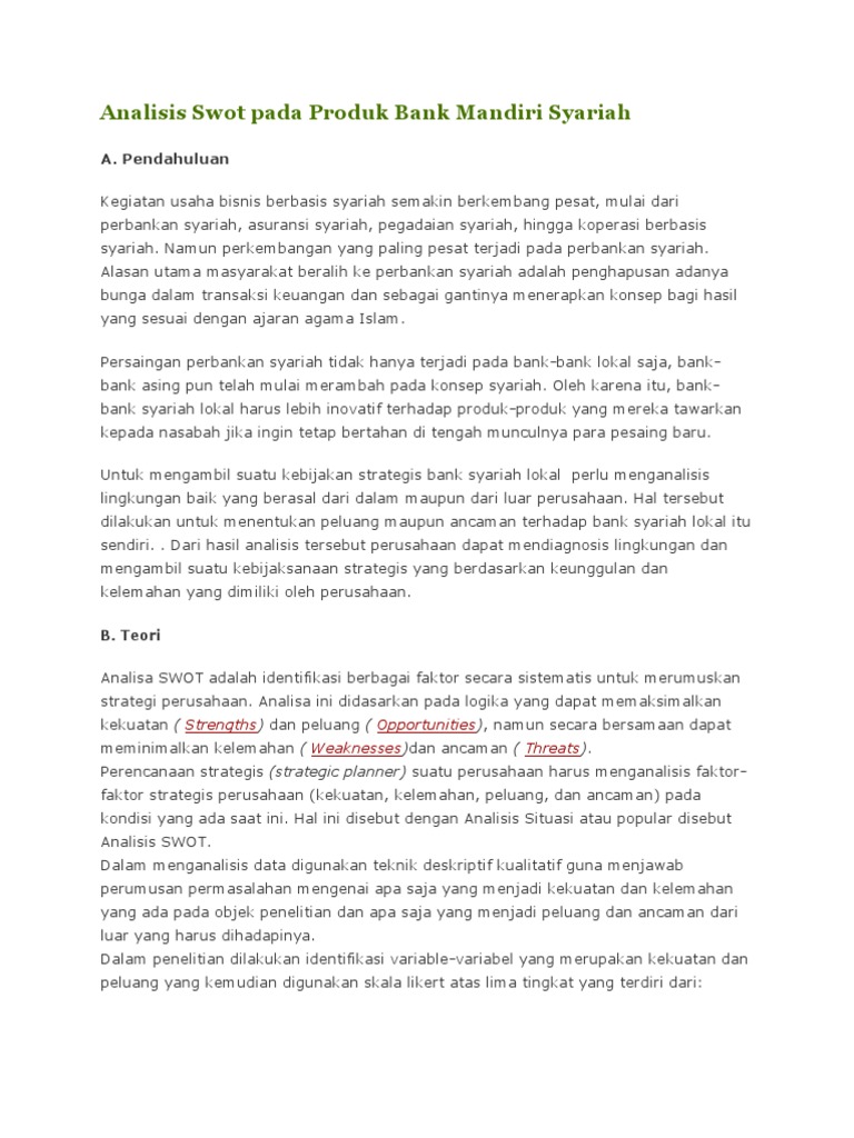 SWOT Analysis for a Bank | Sapling SWOT (strength, weakness, opportunity and threat) analysis for bank management provides a framework to help evaluate a bank's competitive position as well as areas of A SWOT analysis of a bank formally evaluates the financial institution's strengths, weaknesses, opportunities and threats. Devinawangwulan: Analisis SWOT Bank Rakyat Indonesia (BRI) Nama : Devi Nawang Wulan. Kelas : 4 EA 22. NPM : 11216876. Tugas : Mnj. Pemasaran Era Rev. Industri 4#. A. Sejarah Bank Rakyat Indonesia (BRI). Bank Rakyat Indonesia (BRI) adalah salah satu bank milik pemerintah yang terbesar di Indonesia. bankfuzziblog: Swot Bank Mandiri Analisis PESTEL pada Bank Mandiri Tbk. Assalamualaikum, Saya Erika Wijayanti (1702015085) dari 3B Akuntansi Fakultas Ekonomi dan Bisnis Universitas Muhammadiyah Prof. Dr. Hamka (UHAMKA) ... Watch Now. USPS SWOT ANALYSIS- Angelina Murray. Watch Now. Analisis Strategi PT. yUnie suLiz: Analisis SWOT Bank BCA Analisis SWOT Bank BCA. Diposting oleh yUncemoon di 20.36. Analisis SWOT : Menambah rentang produk dan fitur e-banking, Mempertahankan ekuitas merek dengan memeprtahankan biaya transaksi yang murah