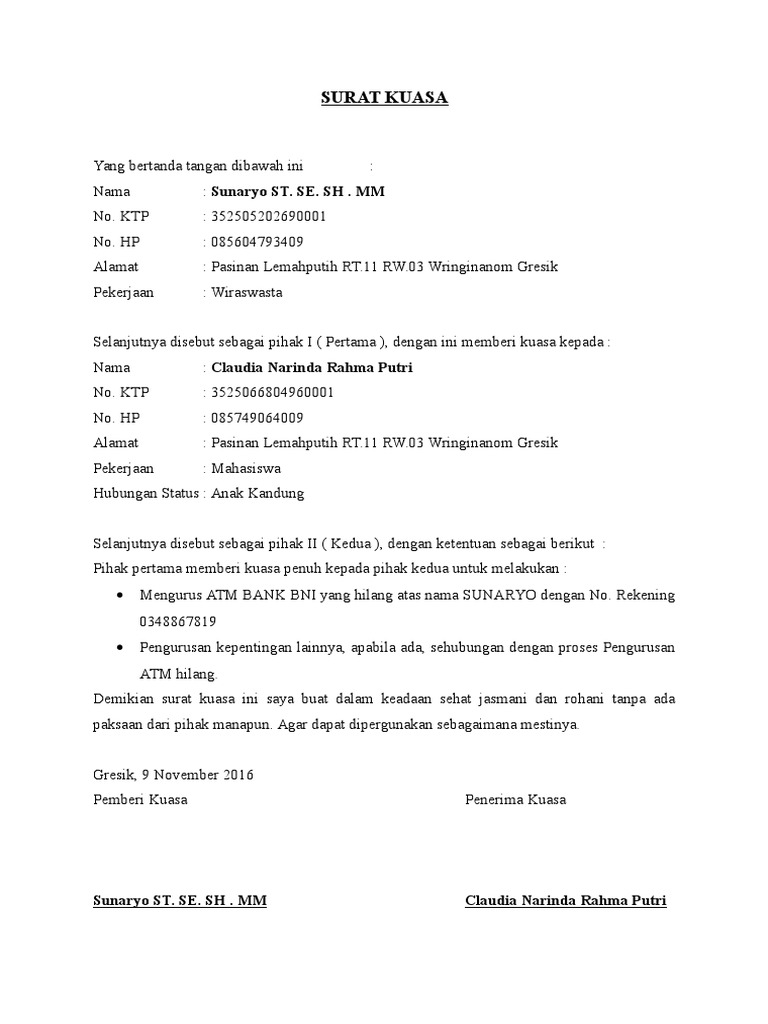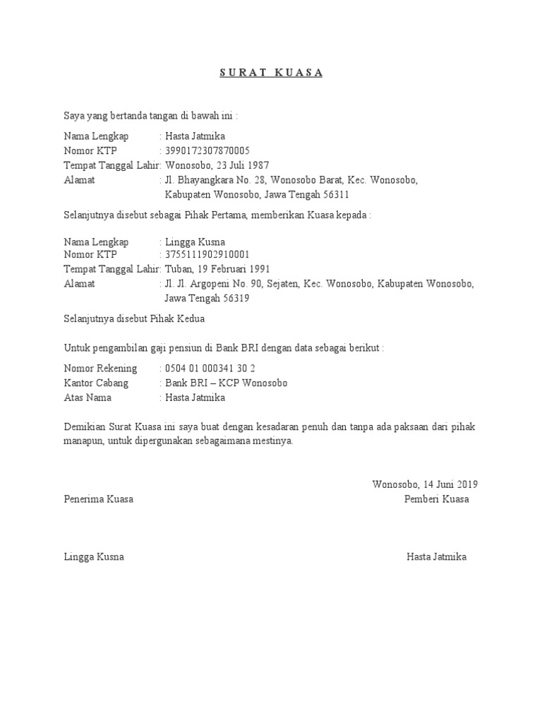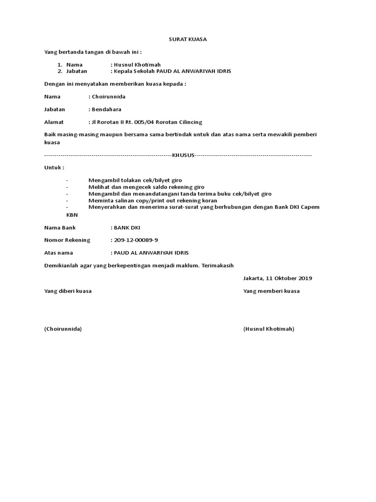 Cek Contoh Surat Kuasa Bank Terbaru, Format & Persyaratannya Surat kuasa bank adalah dokumen yang digunakan untuk mewakilkan segala kepengurusan bank kepada orang lain. Surat ini berfungsi sebagai bukti hukum yang kuat atas pelimpahan wewenang segala keperluan yang bersangkutan dengan bank. Tanpa adanya surat kuasa tersebut, Anda tidak bisa memberikan perwakilan terkait urusan bank pada orang lain. Contoh Surat Kuasa Pengambilan Uang Di Bank 2021 Contoh Surat Kuasa Pengambilan Uang Di Bank - Mari kita lanjutkan pembahasan kita seputar dunia surat-menyurat. Yang akan kita bahas pada kesempatan kali ini adalah mengenai Contoh Surat Kuasa Pengambilan Uang Di Bank.Sekadar mengingatkan para pembaca sekalian bahwa surat kuasa adalah surat yang dibuat dengan tujuan untuk memberikan suatu kuasa atau wewenang kepada pihak tertentu guna ... 7 Contoh Surat Kuasa Bank dan Cara Membuatnya Contoh Surat Kuasa Bank yang Benar 1. Surat Kuasa Pengambilan Uang di Bank BCA Untuk memberikan kuasa mengambil uang di bank BCA kepada orang lain, kamu harus mencantumkan informasi jelas. Informasi tersebut meliputi data diri penerima kuasa, pemberi kuasa, dan melampirkan dokumen pendukung. 2. Contoh Surat Kuasa Bank BNI Contoh Surat Wakil Syarikat - Surat kebenaran / Contoh ... Contoh surat kuasa wakil majikan women s day mp3 & mp4. Related posts to contoh surat kuasa wakil syarikat. Source: image.slidesharecdn.com. Wakil rakyat kumpulan orang hebat bukan kumpulan teman teman. Wakil rakyat kumpulan orang hebat bukan kumpulan teman teman. These are so many great picture list that could become your motivation and .