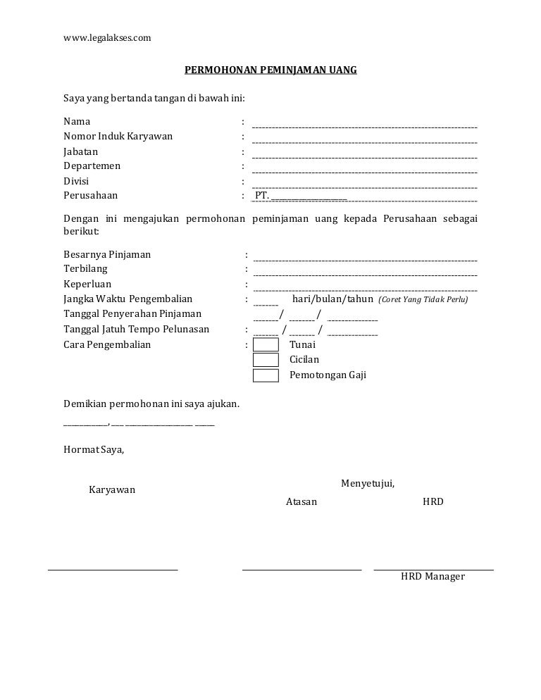 Surat Permohonan Peminjaman Uang Kepada Perusahaan Permohonan peminjaman uang. Saya yang bertanda tangan di bawah ini Dengan ini mengajukan permohonan peminjaman uang kepada Perusahaan sebagai berikut: Besarnya Pinjaman : Rp. _.