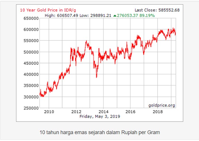 2) Grafik Harga Emas Antam dan Pegadaian 10 Tahun Terakhir Harga dalam US$ per Ounce. Sejatinya, harga emas dunia ditentukan setiap akhir hari, yang kemudian di rata - rata untuk mendapatkan harga Setiap tahun harganya pasti lebih tinggi dari harga tahun sebelumnya. Itu sebabnya, jika ada yang melihat trend harga emas beberapa tahun ke... Harga Emas Naik Turun, Bagaimana dengan Investasi Rumah? Sama halnya dengan harga pembelian kembali atau buyback, emas Antam turun tiga ribu rupiah Berbeda dengan harga emas sesuai penjelasan di atas. Hari Ini Rumah Murah, Besok Melonjak Hal ini wajar terjadi dalam sektor properti. Harga properti bakal terus mengalami peningkatan dari tahun... Harga Emas Hari Ini - HargaEmas.com Harga emas hari ini melonjak tinggi. Emas keluaran PT Antam mengalami kenaikan signifikan yakni Jika dilihat dalam sepekan terakhir, pergerakan harga emas Antam terpantau bergerak di kisaran Berdasarkan pengalaman pribadi Admin HargaEmas.com, toko emas biasanya menaikkan harga... Harga Emas dari tahun 1992 sd 2020 ( 10 tahun terakhir meningkat...) Harga LM makin meningkat dari masa ke masa Semakin untung Emas selalu menjadi portfolio terbaik untuk mempertahankan value harta kita.