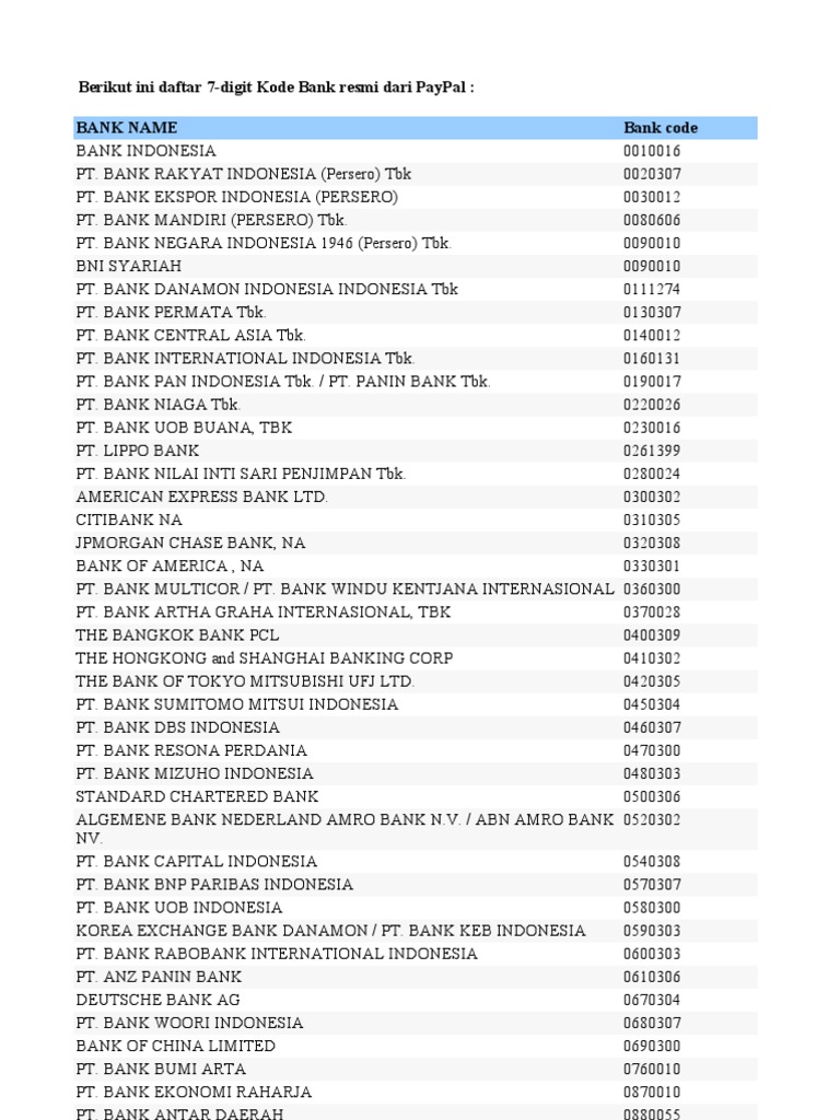 Daftar 7 Digit Kode Identifikasi Bank di Indonesia untuk PayPal 16 Jul 2019 — Berikut adalah daftar 7 digit kode bank resmi dari PayPal. NAMA BANK, KODE BANK. BANK INDONESIA, 0010016. PT. BANK RAKYAT INDONESIA (Persero) ... Daftar 7 (Tujuh) Digit Kode Bank di Indonesia (BANK CODE) Berikut adalah 7 (tujuh) digit kode bank di indonesia : BANK INDONESIA: 0010016; PT. BANK RAKYAT INDONESIA (Persero) Tbk: 0020307; PT. BANK EKSPOR INDONESIA ...