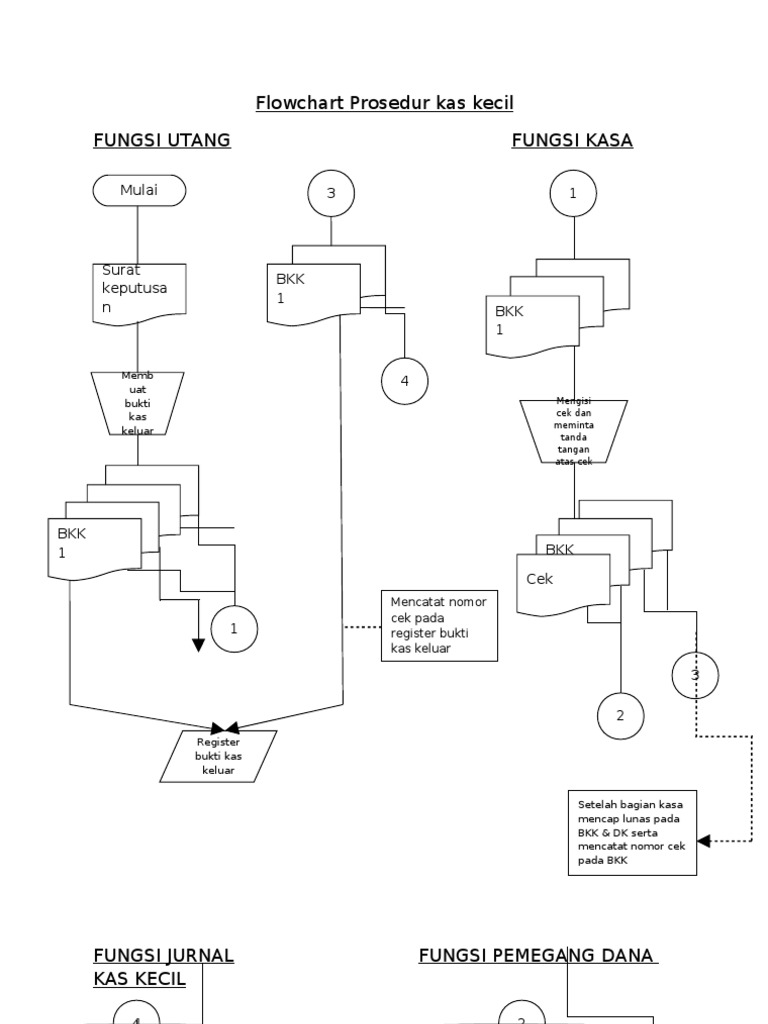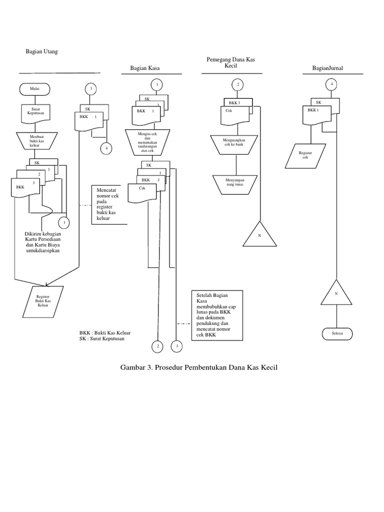 Prosedur Pembentukan Dana Kas Kecil | PDF - Scribd Prosedur Pembentukan Dana Kas Kecil. 1. Bagian utang menyerahkan Bukti Kas Keluar dan Surat Keputusan Pembentukan Dana Kas Kecil (SK) ke bagian kasa. BKK dibuat rangkap 3, 2 rangkap bersama SK dikirim ke bagian kasa dan 1 rangkap dicatat dalam Register Bukti Kas Keluar.