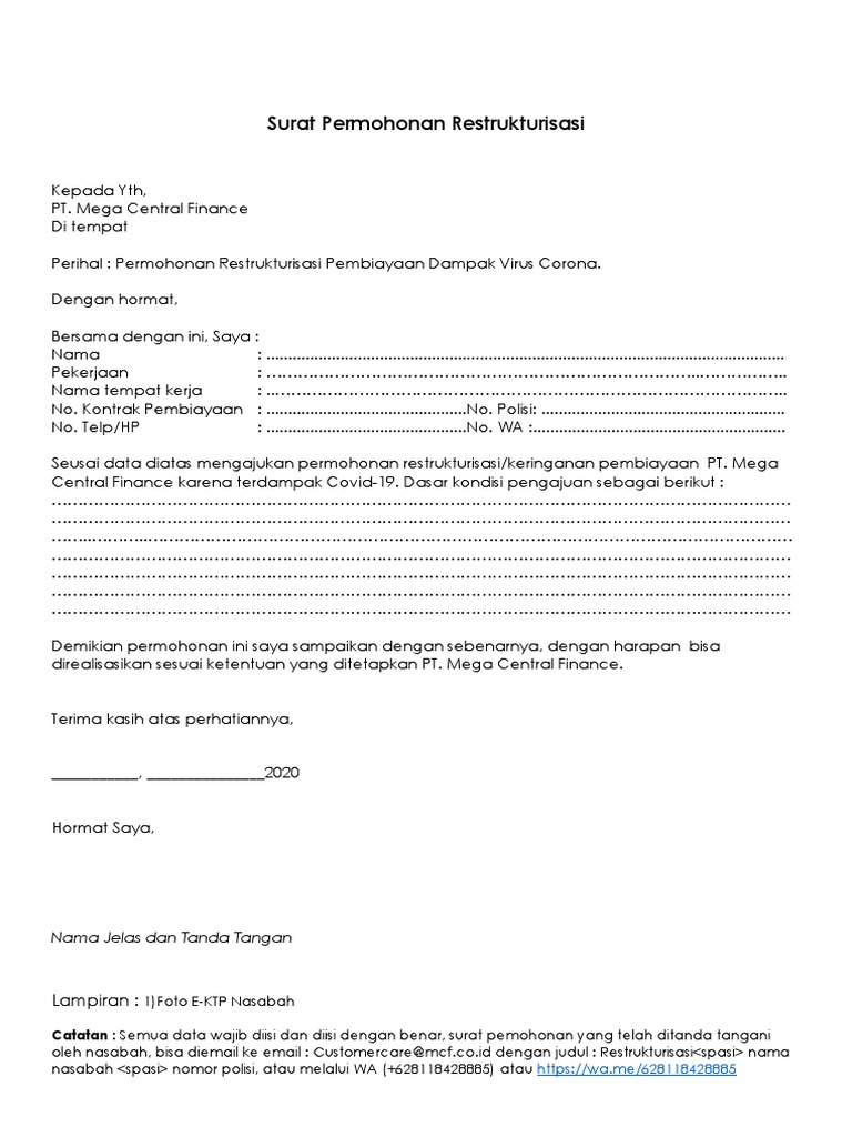 Contoh Surat Permohonan Restrukturisasi Kredit Bank ... Contoh Surat Permohonan Restrukturisasi Kredit Bank - Kemenkopukm On Twitter Nah Sobatkukm Restrukturisasi Relaksasi Kredit Adalah Kelonggaran Penundaan Pembayaran Pokok Dan Bunga Kredit Bagi Mereka Yg Terdampak Covid 19 Apakah Semua Orang Yang Punya Kredit Secara Otomatis Mendapat Keringanan Ini / Pemberi pernyataan berjanji dan mengikatkan diri kepada pt hasjrat multifinance bahwa pembayaran ...