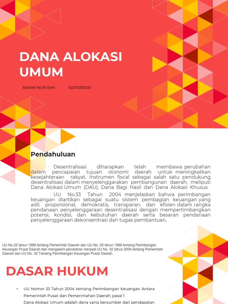 Penghitungan Dana Alokasi Umum - Romypradhanaarya's Blog 1. Penghitungan Dana Alokasi Umum Menurut UU No. 33 Tahun 2004 RUMUS : DAU = Celah Fiskal + Alokasi Dasar Celah Fiskal adalah: Celah Fiskal = Bobot Celah Fiskal x DAU seluruh kab/kota DAU seluruh kabupaten/kota = 90% x (26% x Pendapatan Dalam Negeri Netto) Bobot celah fiskal daerah = celah fiskal daerah/total celah…