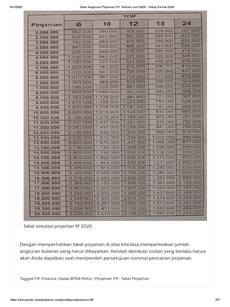Tabel Angsuran Pinjaman FIF 2022: Syarat & Keunggulan ... Silakan simak ulasan mengenai tabel angsuran pinjaman FIF 2022 jaminan (gadai) BPKB Motor selengkapnya. Nama FIF Group atau FIF Finance tentu sudah tidak asing lagi terdengar di telinga kita.. Perusahaan di bawah Astra tersebut kini tidak hanya fokus membiayai pembelian sepeda motor saja melainkan juga menawarkan pinjaman dana tunai FIF. Tabel Angsuran FIF, Syarat Pinjaman 2022 Tabel Angsuran Pinjaman FIF, Syarat Pinjaman 2021 - Banyak orang yang memilih untuk kredit motor, elektronik dengan menggunakan leasing FIF. Banyak juga orang yang meng agunkan BPKB kendaraan mereka ke FIF untuk peminjaman uang.