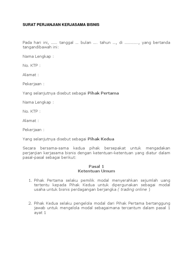 Surat Perjanjian Kerjasama Bisnis | PDF - Scribd Unduh sebagai DOCX, PDF, TXT atau baca online dari Scribd ... kedua pihak bersepakat untuk mengadakan perjanjian kerjasama bisnis dengan ketentuan-ketentuan ...