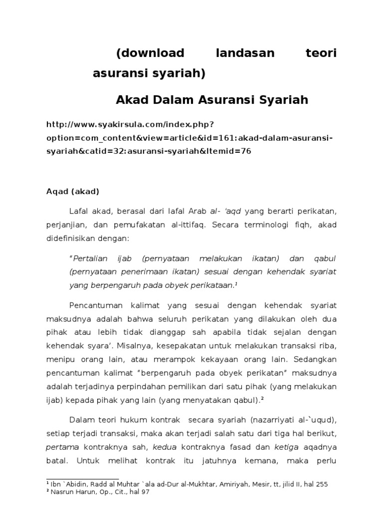 PDF Asuransi Dalam Tinjauan Hukum Islam - Takaful Umum AsuransiAsuransiDalam DalamLiteraturLiteraturIslam Islam Dalam literatur klasik fiqh Islam, terdapat beberapa akad yang dalam beberapa sisi memiliki kemiripan dengan sistem asuransi syariah yang tentunya memiliki corak dan warna keislaman (ta'awuni), diantaranya adalah : 1. Nidzam Aqilah 2. Al-Qasamah 3. Al-Muwalah 4. At-Tanahud 5. Aqdul Hirasah 6. Pengertian Asuransi Syariah, Dasar Hukum, Syarat, Rukun ... dalam buku aqdu at-ta'min wa mauqifu asy-syari'ah al-islamiyah minhu, az-zarqa juga mengatakan bahwa sistem asuransi yang dipahami para ulama hukum (syariah) adalah sebuah sistem ta'awun dan tadhamun yang bertujuan untuk menutupi kerugian peristiwa-peristiwa atau musibah-musibah. tugas ini dibagikan kepada sekelompok tertanggung, dengan cara … ASURANSI DALAM ISLAM - STAI Al Hidayah Bogor Asuransi syariah dalam akadnya kepada nasabah adalah ta'awun atau tolong menolong, bukan tabadulli atau jual beli dalam hal resiko. Jadi dalam akad tidak ada pemindahan uang premi dari segi kepemilikan. Nasabah hanya menitipkan uang premi yang sebagian diikhlaskan untuk dimasukkan ke dalam rekening tabarru' atau dana kebajikan.
