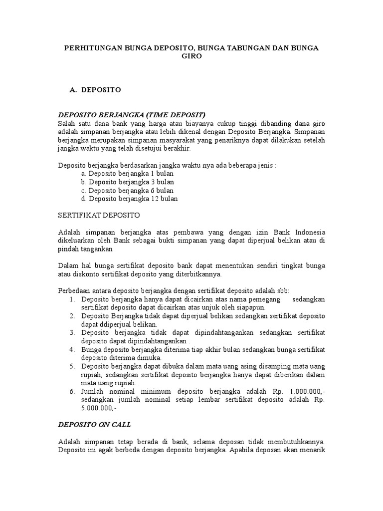 Bunga Deposito Tertinggi 2022, Ini Daftarnya | kumparan.com Bunga Deposito Tertinggi 2022. Berikut daftar bunga deposito tertinggi 2022 yang dihimpun melalui Pusat Informasi Pasar Uang (PIPU) Bank Indonesia dan berbagai sumber. Deposito 1 Bulan. Bank DBS sebesar 6 persen. Bank Mayora sebesar 5,5 persen. Bank Bukopin sebesar 5,25 persen. Bank Victoria sebesar 5,25 persen. BNI sebesar 4,25 hingga 5,5 persen. Bunga Deposito Bank di Indonesia 2020, Tertinggi ke ... Dibandingkan tabungan, bunga deposito juga biasanya lebih tinggi dari bunga tabungan, yakni berkisar antara 5-7% dari jumlah dana kamu. Untuk lebih jelasnya tentang suku bunga deposito rupiah dari berbagai bank di Indonesia ini. Berikut detail informasinya yang dilansir dari Pusat Informasi Pasar Uang (PIPU) Bank Indonesia. Suku Bunga Deposito Bank Indonesia - Apps on Google Play Aplikasi ini memberikan informasi terupdate dan akurat nilai persentase suku bunga deposito setiap Bank di Indonesia. Tujuan aplikasi ini untuk membantu para investor untuk menginvestasikan dana ke pilihan yang tepat. Berikut list detail suku bunga bank yang ada seperti: - Bank BCA - Bank Mandiri - Bank BTN - Bank BNI