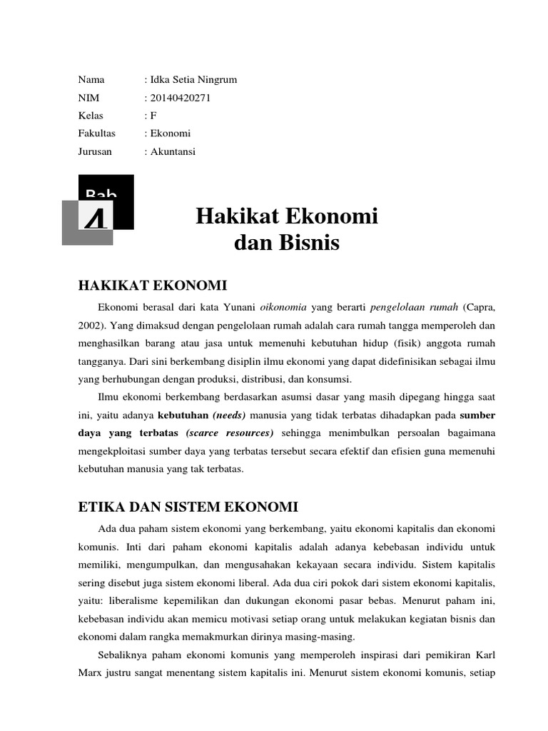 Unsur -Unsur penting Dalam Aktifitas Ekonomi Dan Hakikat Bisnis oleh ahli-ahli ekonomi. Hakikat Bisnis. Hakikat bisnis adalah usaha untuk memenuhi kebutuhan manusia, organisasi ataupun masyarakat luas. Businessman (seorang pebisnis) akan selalu melihat adanya kebutuhan masyarakat dan kemudian mencoba untuk melayaninya secara baik sehingga... [PDF] Etika Bisnis (Hakikat Ekonomi Dan Bisnis) - Free Download... Report "Etika Bisnis (Hakikat Ekonomi Dan Bisnis)". Please fill this form, we will try to respond as soon as possible. Download "Etika Bisnis (Hakikat Ekonomi Dan Bisnis)". We are a sharing community. So please help us by uploading 1 new document or like us to download Bab 4 Hakikat Ekonomi dan Bisnis - PDF Free Download hakikat manusia dan masyarakatFull description. matematika ekonomi bisnis. Contoh bentuk RPP kurikulum 2013 pelajaran Pengantar Ekonomi dan Bisnis kelas XI AK/AP/PM SMKN 47 JAKARTA, KD 3.1 dan 4.1 dengan Topik Pasar Persaingan Monopolistik. Bab 4 Hakikat Ekonomi dan Bisnis BAB 4HAKIKAT EKONOMI dan BISNIS1. HAKIKAT EKONOMIIlmu ekonomi adalah sebagian ilmu yang berhubungan dengan produksi, distribusi, dan konsumsi.