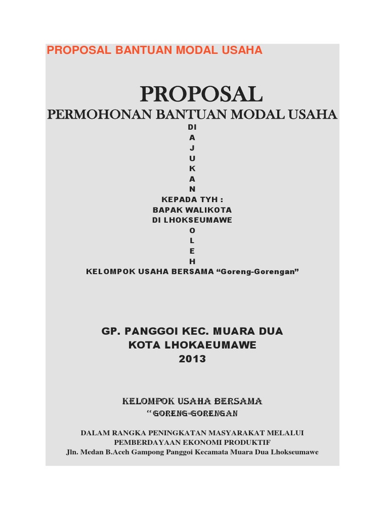 (DOC) PROPOSAL PENGAJUAN DANA USAHA... - Academia.edu Proposal pengajuan dana usaha pisang coklat lumer weleri. Vira Auliana. B. Tujuan Tujuan dari pengembangan Proposal Usaha Piscok ini adalah memberikan nuansa yang berbeda kepada pecinta makanan bahwa di Indonesia memiliki beraneka ragam makanan yang lebih...