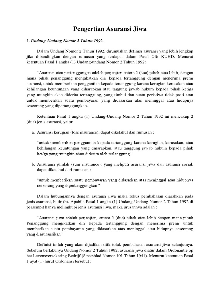 PDF Undang-undang Republik Indonesia Nomor 2 Tahun 1992 ... Dalam Undang-undang ini yang dimaksud dengan 1. Asuransi atau Pertanggungan adalah perjaniian antara dua pihak atau lebih, dengan mana pihak penanggung mengikatkan diri kepada tertanggung, dengan menerima premi asuransi, untuk memberikan penggantian kepada tertanggung karena kerugian,