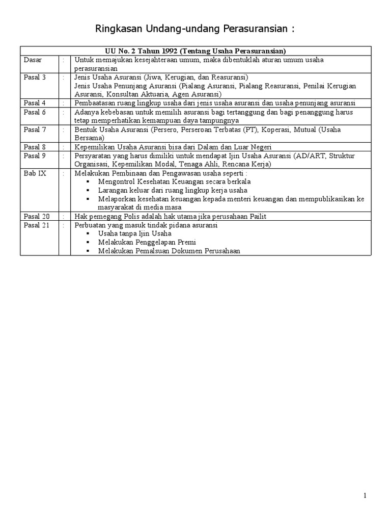 UU No. 40 Tahun 2014 tentang Perasuransian [JDIH BPK RI] Undang-Undang ini juga mengharuskan penyelenggaraan Program Asuransi Wajib, misalnya asuransi tanggung jawab hukum kepada pihak ketiga bagi pengendara kendaraan bermotor, secara kompetitif dan memungkinkan pemberian fasilitas fiskal kepada perseorangan, rumah tangga, dan/atau usaha mikro, kecil, dan menengah untuk mendorong peningkatan ... PDF Undang-undang Republik Indonesia Tentang Dengan Rahmat ... Asuransi Syariah, perusahaan reasuransi, atau perusahaan reasuransi syariah. 34. Setiap Orang adalah orang perseorangan atau korporasi. 35. Otoritas Jasa Keuangan adalah lembaga pengatur dan pengawas sektor jasa keuangan sebagaimana dimaksud dalam undang-undang mengenai otoritas jasa keuangan. 36. 5 Dasar Hukum Asuransi di Indonesia - DosenEkonomi.com 1.Undang-Undang Nomor 2 Tahun 1992. Dilihat dari kedudukannya, undang-undang ini sering kali dijadikan sebagai dasar dari beberapa penetapan peraturan mengenai asuransi yang berlaku di Indonesia. Sehingga bisa dikatakan jika Undang-Undang Nomor 2 Tahun 1992 merupakan dasar hukum utama yang mengatur dan menentukan segala kegiatan asuransi.