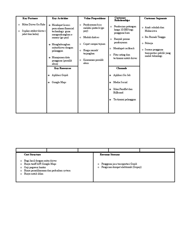 Contoh Bisnis Model Canvas Gojek Contoh Bisnis Model Canvas Gojek. Berikut contoh analisa bisnis model canvas perusahaan Gojek dalam versi tulisan. · VALUE PROPOSITIONS. Menyediakan transportasi massal yang berkualitas, mudah serta cepat diakses, dengan harga terjangkau. · COSTUMER SEGMENTS. Pelajar sekolah.