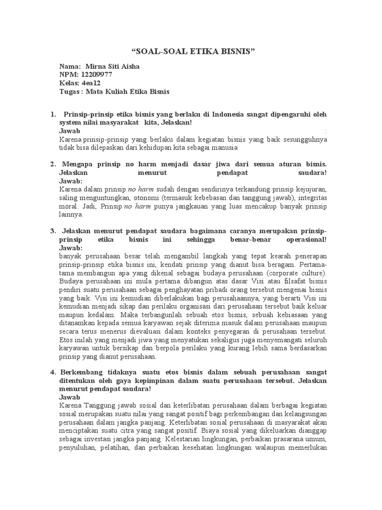 (Pdf) Etika Bisnis Dan Tanggungjawab Sosial Perusahaan ... Etika bisnis dan tanggung jawab sosial perusahaan.merupakan dua permasalahan yang seringkali kurang diperhatikan oleh para pelaku bisnis karena itu dalam artikel ini akan dibahas bagaimana hubungan etika bisnis dengan tanggung jawab sosial perusahaan. PENTINGNYA ETIKA BISNIS Diskusi tentang etika dalam bisnis diperlukan karena bisnis bisa ... ETIKA BISNIS & TANGGUNG JAWAB SOSIAL - semuanya tentang ilmu Permasalahan individual dalam etika bisnis adalah pertanyaan yang muncul seputar individu tertentu dalam perusahaan. Masalah ini termasuk pertanyaan tentang moralitas keputusan, tindakan dan karakter individual. Berikut adalah beberapa alasan perusahaan lebih memilih melakukan tanggung jawab sosial dalam menerapkan etika bisnis antara lain : Pertanyaan Tentang Etika Dan Moral - Beinyu.com Pertanyaan Tentang Etika Bisnis Dan Tanggung Jawab Sosial 2. Selama ini pelajaran etika moral dan akhlak sudah diperkenalkan sejak kita berada di Sekolah Dasar bahkan pengenalan ertika moral dan akhlak sudah di ajarkan dalam lingkup keluarga. Pertanyaan Tentang Etika Bisnis Dan Tanggung Jawab Sosial ... 31 Pertanyaan Tentang Etika Bisnis Dan Tanggung Jawab Sosial - Info Dana Tunai Etika Bisnis Adalah -Pengertian, Makalah, Teori, Prinsip & Contoh √ 30+ Pertanyaan tentang Etika Bisnis Paling Lengkap