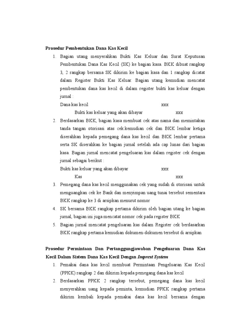 Hal 342-348 (Akuntansi CH7).docx - PENGENDALIAN ... Pengoperasian dana kas kecil, sering disebut sistem imprest (uang muka untuk tujuan yang telah ditentukan), melibatkan (1) pembentukan dana, (2) melakukan pembayaran dari dana, dan (3) pengisian dana. Pembentukan Dana Kas Kecil Langkah-langkah: (1) menunjuk penjaga kas kecil yang akan bertanggung jawab atas dana tersebut, dan (2) menentukan ... zahiraccounting.com › id › blogKas Kecil: Pengertian, Fungsi dan Prosedur Pengelolaannya - Zahir Sep 23, 2021 · Pembentukan Dana Kas Kecil dilakukan dengan cek dan dicatat dengan mendebit akun Dana Kas Kecil. Saldo akun Dana Kas Kecil ini tidak boleh berubah dari yang ditetapkan sebelumnya, kecuali jika saldo yang telah ditetapkan tersebut dinaikkan atau dikurangi. Kas Kecil: Pengertian, Pembentukan, Fungsi, Dan Metode Kas ... Dalam pembentukan dana kas kecil yang mana pemegang kas kecil akan diberi beberpa uang tunai yang digunakan untuk pembayaran atas pengeluaran dan diperkirakan dapat memenuhi kebutuhan dalam periode tertentu. Dana kas kecil dimanfaatkan untuk pembayaran dalam transaksi pengeluaran. Pengertian, Tujuan, Metode dan Contoh Kas Kecil - Jurnal Tujuan Kas Kecil Ada beberapa tujuan kas kecil adalah untuk beberapa berikut di antaranya: Menangani masalah perlengkapan/perbekalan kantor yang dialami oleh suatu bagian di kantor. Menghindari cara pembayaran yang tidak ekonomis juga tidak praktis atas pengeluaran yang jumlahnya relatif kecil dan mendadak.