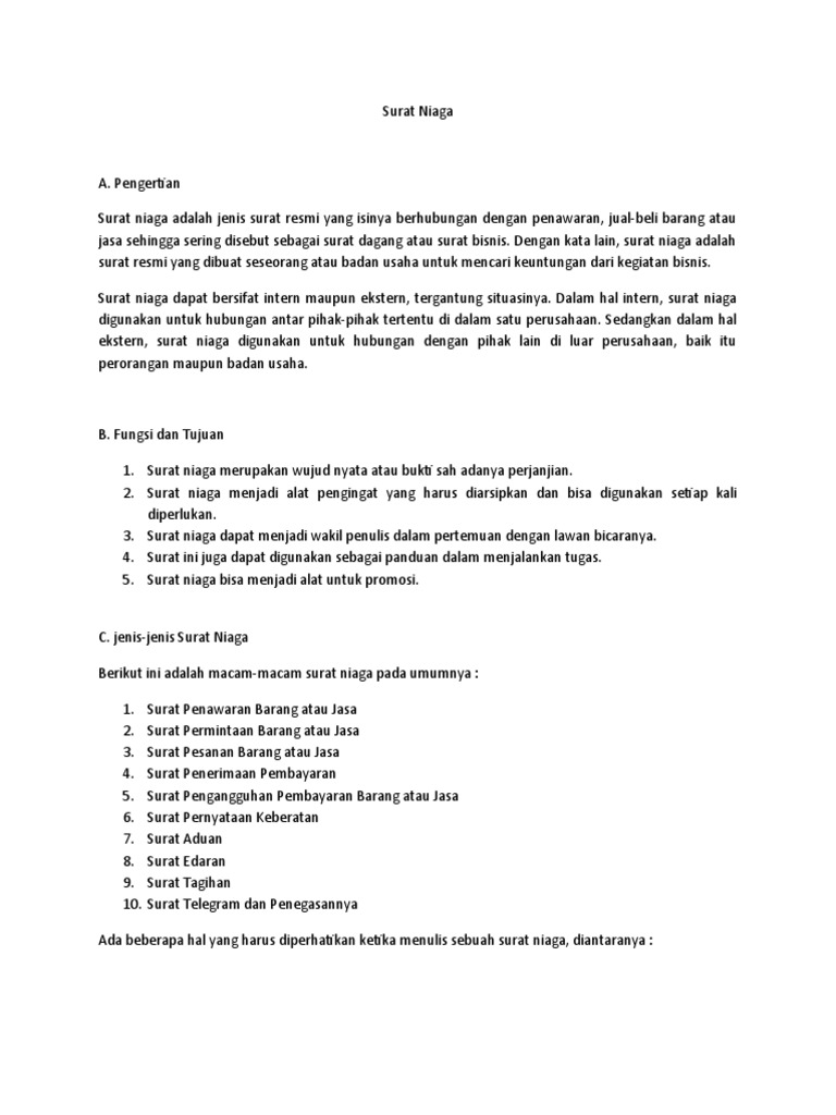 Pengertian, Fungsi, Syarat dan Jenis-jenis Surat - KajianPustaka.com c. Jenis surat berdasarkan isi atau kepentingannya. Surat niaga atau bisnis, yaitu surat yang digunakan sebagai alat komunikasi persoalan bisnis dikalangan pengusaha atau badan-badan usaha dalam menjalankan kegiatan usahanya.
