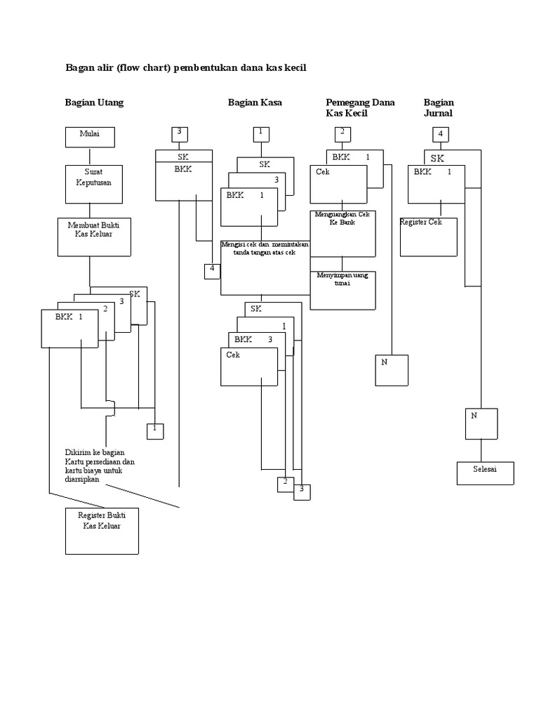 Materi Kas Kecil Full - Asep Nurholik a. fungsi pemegang dana kas kecil. 1. pemegang as kecil membuat permintaan pengisian kembali kas kecil PP3K. 2. menyerahkan PP3K lembar 1 dan 2,BPKK, dan dokumen pendukung kepada bagian utang. 3. menerima bukti kas keluar (BKK) lembar 3 dan cek bagian utang. 4. mengunakan cek ke bank. 5. menyimpan uang tunai. Soal Pilihan Ganda Dan Jawabannya Tentang Dana Kas Kecil ... e.Pencatatan selisih kas kecil 8.Dokumen yang dibuat oleh kasir kas besar setelah bukti pengeluaran kas pembent ukan dana kas kecil disetujui oleh direktur keuangan untuk dicairkan oleh bendahara kas k ecil ke bank adalah … . a.Bukti kas keluar RPP KAS KECIL KELAS XII APPage 11 b.Faktur c.Cek. d.Bukti pengeluaran kas kecil e.Permintaan ...
