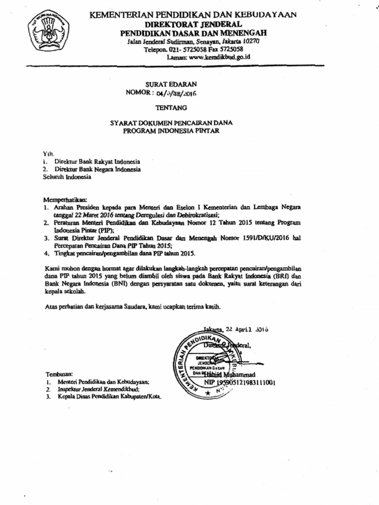 Persyaratan Dokumen Yang Harus ... - Blognya Abiey Kayla Sekolah akan mengirim berkas dokument persyaratan pencairan PIP ke Bank yang ditunjuk sebagai penyalur dana PIP, biasanya bank BRI terdekat Adapun persayartan yang harus dilengkapi untuk pencairan PIP sesuai surat edaran no.06/D/SE/2016 tentang syarat dokumen pencairan dana Program Indonesia Pintar yang belum diambil oleh siswa terdiri dari hal ... Contoh Berkas Pencairan PIP 2020 - NOM IFROD Contoh Berkas Pencairan PIP 2020 - Assalamu alaikum bapak ibu guru di seluruh Indonesia. Kali ini saya akan ingin ikut berbagi update berkas PIP 2018 yang terdiri dari surat kuasa, surat keterangan dan surat pernyataan tanggung jawab mutlak (sptjm), dan dilengkapi dengan foto copy kartu keluarga dan KTP salah satu orang tua.. Syarat Aktivasi Rekening Dan Pencairan Dana Bantuan Sosial PIP ... Cara Aktivasi dan Pencairan Rekening PIP - INFO PNS dan ... Cara Aktivasi Siswa Nominasi di PIP Kemdikbud. Jika operator login di laman pip.kemdikbud.go.id maka ada ada menu Siswa nominasi, siswa nominasi disini adalah siswa calon penerima PIP, biasanya kebanyakan kelas 1 SD. Siswa Nominasi ini wajib melakukan aktivasi rekening ke Bank BRI. Caranya sama seperti di atas. Format Dokumen Pencairan PIP Tahun 2021 - Kherysuryawan.id Ada beberapa bank yang biasanya di pilih sebagai partner dalam melakukan pencairan bantuan PIP diantaranya bank BRI, bank BNI, bank mandiri dan mungkin masih ada lagi bank lainnya yang telah di tentukan sebagai bank penyalur bantuan PIP. ... Lembar ini diperlukan apabila akan langsung melakukan pencairan/pengambilan dana PIP (disediakan oleh bank).