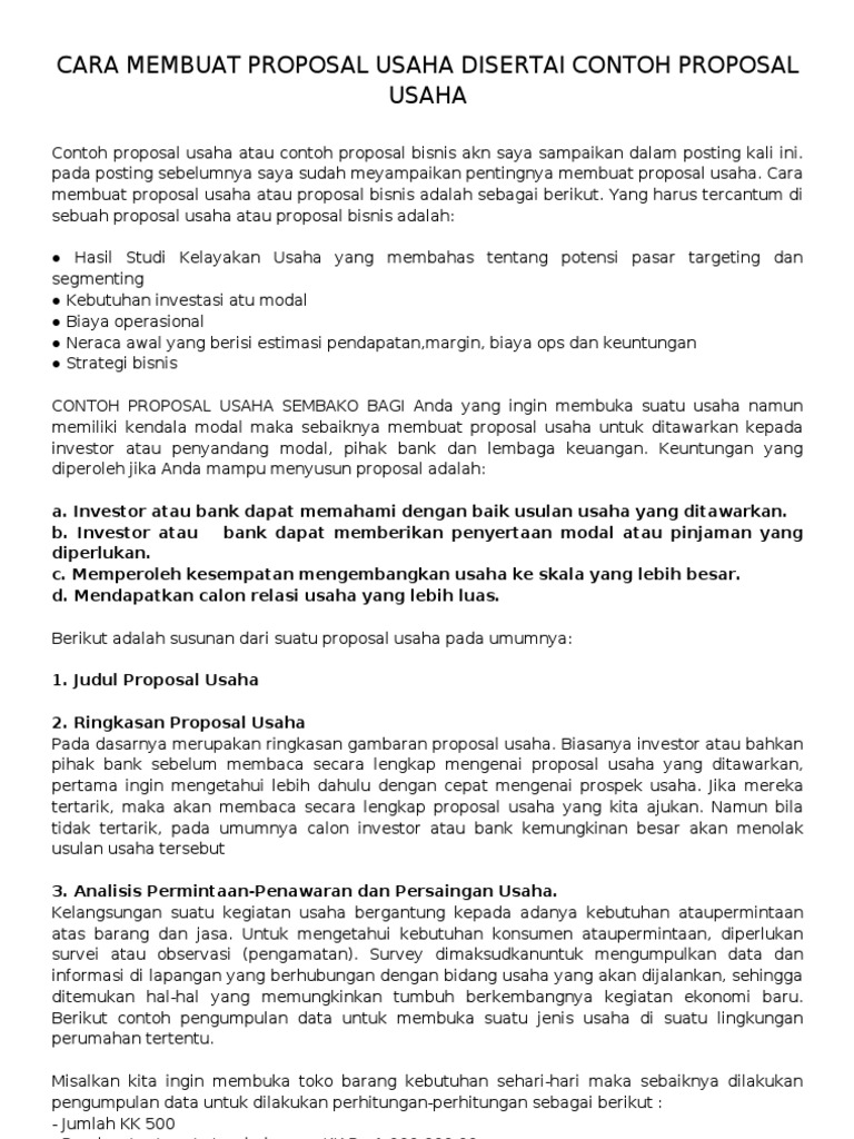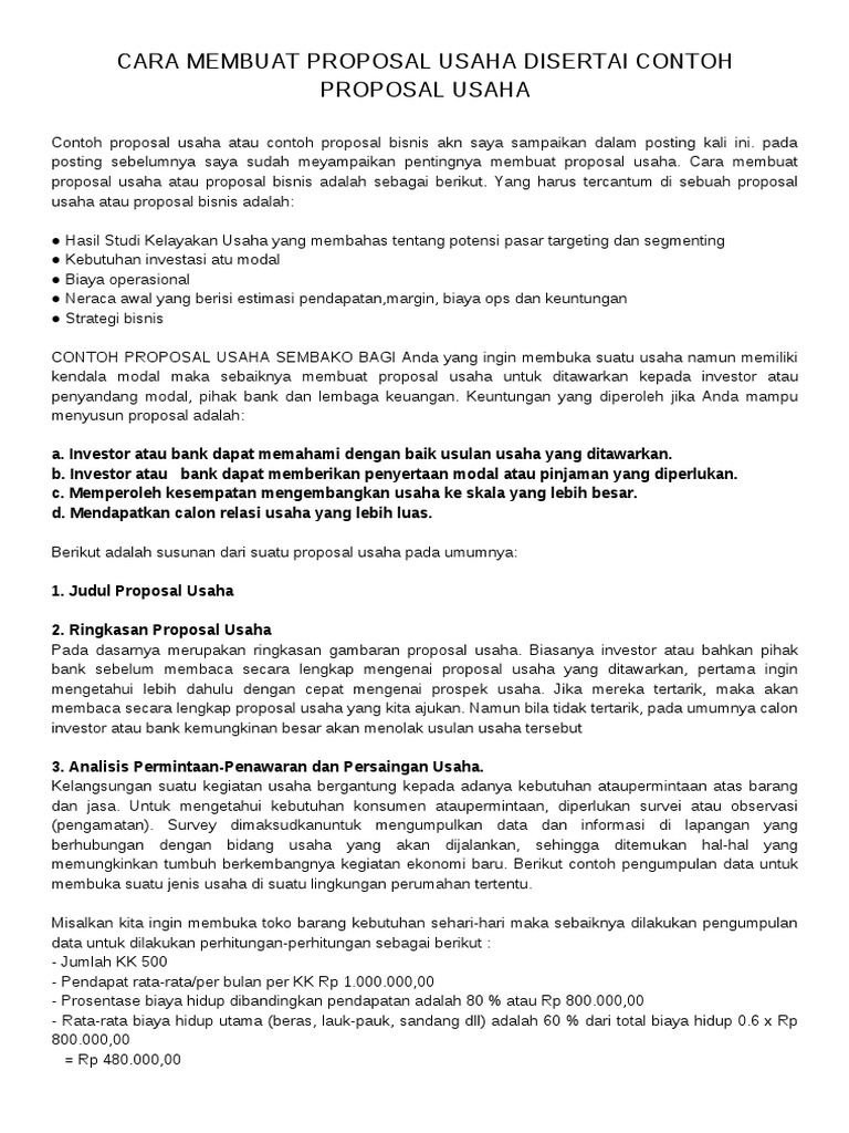 Cara Membuat Proposal Bisnis & Contoh yang Menarik ... Cara Membuat Proposal Bisnis Bagi kamu yang ingin menarik investor, berikut ini adalah cara membuat proposal bisnis yang harus kamu ketahui. 1. Membuat Bab Pendahuluan Bab pendahuluan sangat penting bagi investor agar mengetahui latar belakang bisnis atau usaha yang kamu jalani. Contoh Proposal Usaha / Kewirausahaan / Bisnis [Cara ... Contoh Proposal Usaha / Kewirausahaan / Bisnis Plan (Cara Membuat Proposal Usaha) 4 min read. Hai sobat sharing, pada kesempatan ini saya akan menguraikan 'contoh proposal usaha'. Setelah sebelumnya saya menulis tentang contoh proposal kegiatan. Bagi Anda yang ingin mendirikan sebuah usaha, tentu yang menjadi kendala terbesar adalah modal. PDF Tips Membuat Dan Contoh Proposal Bisnis Plan Akuratpost Membuat Dan Contoh Proposal Bisnis Plan Akuratpost knowledge that, people have look hundreds times for their favorite readings like this tips membuat dan contoh proposal bisnis plan akuratpost, but end up in harmful downloads. Rather than enjoying a good book with a cup of tea in the afternoon, instead Page 2/48 Bagaimana Cara Membuat Proposal Usaha? - Moka POS Perencanaan ini bisa dibuat dalam bentuk proposal usaha. Proposal usaha adalah cara ideal untuk mencatat perencanaan bisnis karena di dalamnya terdapat banyak aspek yang berkaitan dengan bisnis seperti analisis SWOT, perkiraan modal, peluang pasar, hingga rincian produk atau jasa.