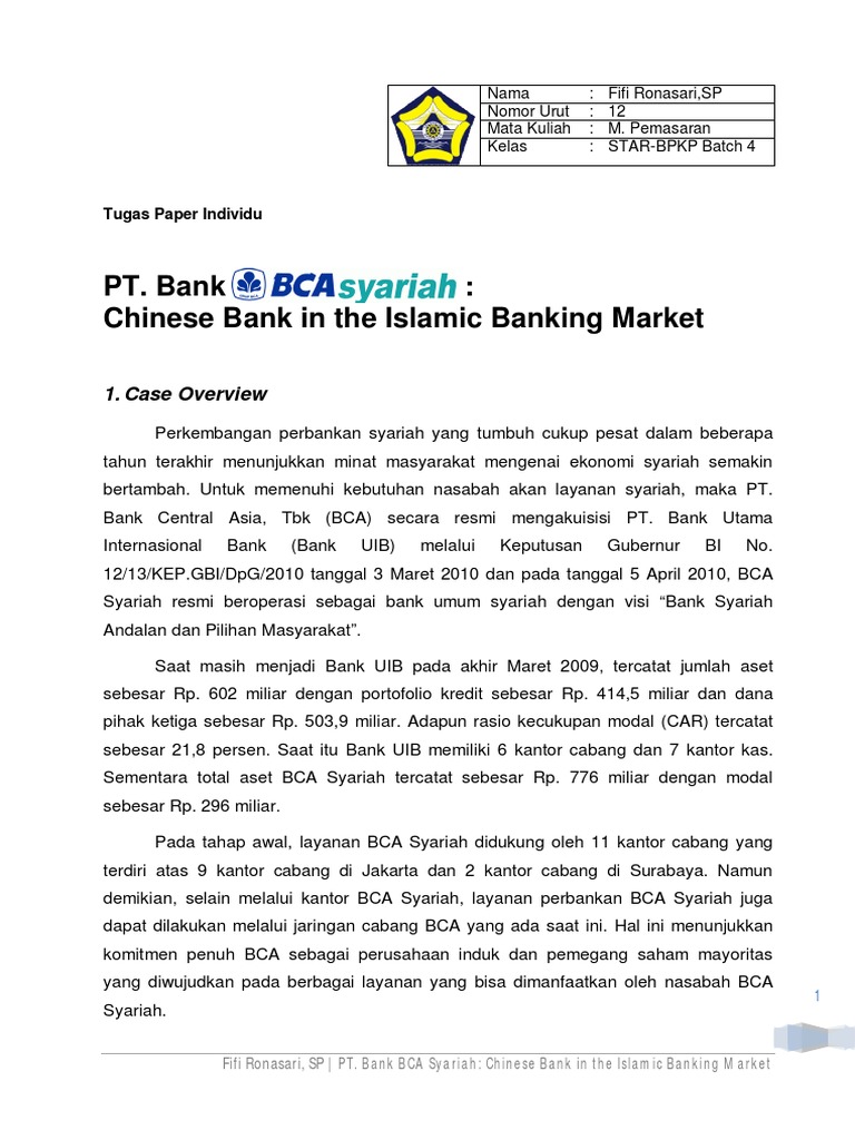 Profil BCA Syariah - SyariahBank.com Dengan Visi "Menjadi Bank Andalan dan Pilihan Masyarakat", BCA Syariah mencanangkan untuk menjadi pelopor dalam industri perbankan syariah Indonesia yang unggul dibidang penyelesaian pembayaran, penghimpin dana dan pembiayaan bagi nasabah perseorangan, mikro kecil dan menengah.