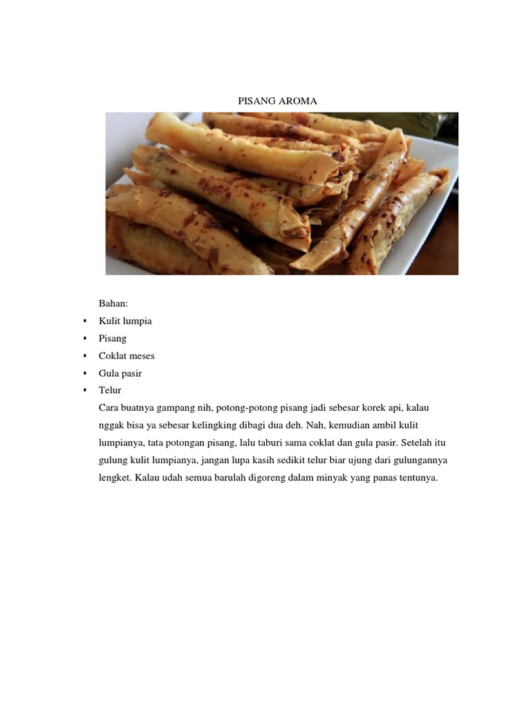 mbaratna.com › 2011 › 03Pisang Aroma - mbaratna.com Mar 26, 2011 · Sebab aslinya, pisang aroma itu bukan pisang tetapi kulit lumpia berisi keju, coklat meses, irisan nangka, atau irisan pisang, yang digoreng hingga kering. Karena bentuknya seperti pisang tapi ada aroma makanan lain maka disebut pisang aroma. Mungkin yang saya buat ini lebih sesuai diberi judul lumpia pisang. Karena memang terbuat dari kulit ...