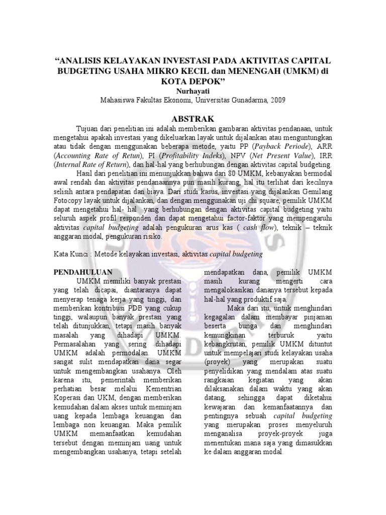 (Pdf) Analisis Kelayakan Investasi Dalam Rangka Ekspansi ... Dalam analisis capital budgeting diadakan suatu penilaian kelayakan investasi dengan menggunakan 5 metode yaitu: metode Payback Period (PP), metode Net Present Value (NPV), metode Profitability Index (PI), metode Internal Rate of Return (IRR), dan metode Average Rate of Return (ARR).