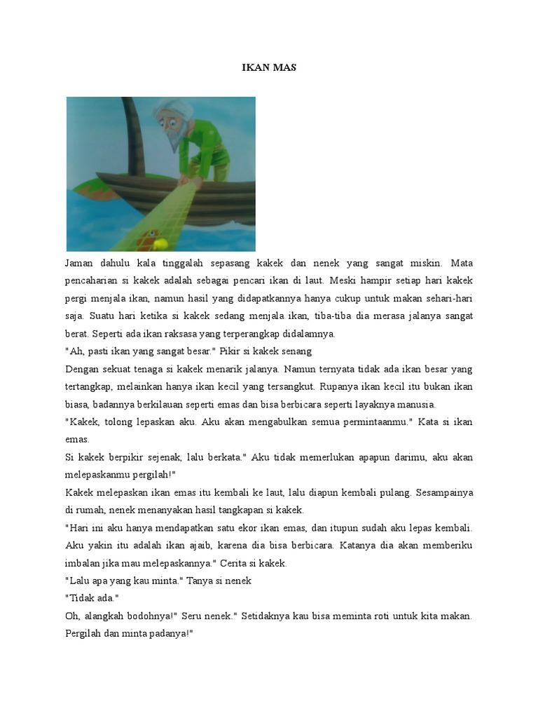 Learn Indonesian! Serigala Besar Jahat itu Kaya! Memoar ... Nicole Russin-McFarland · Foreign Language StudyAkan kuberikan kau baju sakti miliku ini!Baju ini bisa memberikanmu apapun logam yang kau inginkan seperti emas, perak, besi atau apapun yang kau mau. Dongeng Anak: Dongeng Rakyat: Paman Gober dan ikan ajaib Gober berpikir, "Ikan yang bisa berbicara pasti ikan ajaib dan barangkali ikan ini memang. benar-benar dapat mewujudkan apa yang paling kuinginkan." Paman Gober akhirnya. meminta agar gudang uangnya. dipenuhi dengan uang. "Kau akan mendapatkan apa yang kau. inginkan, pulang dan lihatlah gudang uangmu sekarang. Setelah melemparkan ikan itu ke. Ikan Emas Ajaib - Kumpulan Dongeng Dongeng Ikan Emas Ajaib. Ikan Emas Ajaib. Pada zaman dahulu kala, di sebuah pulau bernama Buyan, tinggalah sepasang kakek dan nenek yang sangat miskin. Mata pencaharian si kakek adalah mencari ikan di laut. Meski hampir setiap hari kakek pergi menjala ikan, namun hasil yang didapat hanya cukup untuk makan sehari-hari saja. Suatu hari ketika si ...