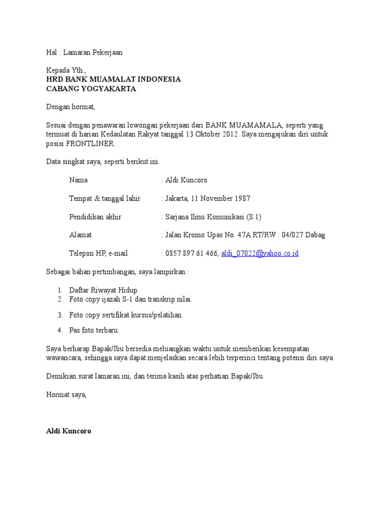 Contoh Surat Lamaran Kerja di Bank BCA - Contoh Surat ... Dari beberapa tips di atas mudah-mudahan dapat membantu anda dalam membuat surat lamaran kerja di Bank BCA, namun untuk melihat lebih jelasnya bagaimana format surat lamaran kerja di bank yang baik dan benar, berikut telah saya siapkan contohnya untuk anda. Contoh Surat Lamaran Kerja di bank BCA Lulusan SMA Kepada Yth, HRD Bank BCA KCU Solo 1 di - Contoh Surat Lamaran Kerja di Bank berdasarkan bursa kerja ... Berikut ini Contoh Surat Lamaran Kerja di Bank nya gan, cekidot: PT. Bank Pundi Bandung. Berdasarkan informasi yang saya terima melalui bursa kerja (job fair) yang diadakan di Land Mark Braga pada tanggal 13-15 Desember 2016, bersama surat ini saya bermaksud mengajukan lamaran untuk bekerja di PT.