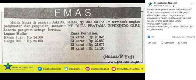 Berikut adalah harga emas per gram... - Perpustakaan ... Perpustakaan Nasional. December 12, 2019 ·. Berikut adalah harga emas per gram pada tahun 1985. Sumber: Sinar Harapan, 5 Mei 1986. Koleksi Surat Kabar Langka Terjilid Perpusnas Ri (SKJIL-Team) Here is the price of gold per gram in 1985. Source: Rays of Hope, May 5, 1986.