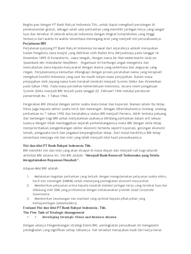 Sejarah dan Visi Misi Bank Rakyat Indonesia (BRI ... Bank Rakyat Indonesia (Persero) Tbk., yang masih digunakan sampai dengan saat ini. Visi dan Misi Visi BRI Menjadi bank komersial terkemuka yang selalu mengutamakan kepuasan nasabah. Misi BRI Melakukan kegiatan perbankan yang terbaik dengan mengutamakan pelayanan kepada usaha mikro, kecil dan menengah untuk menunjang peningkatan ekonomi masyarakat.